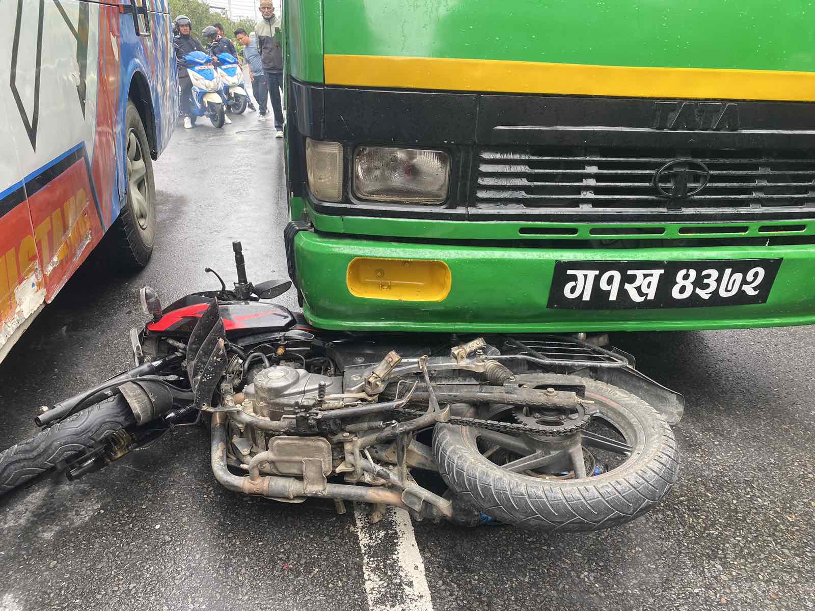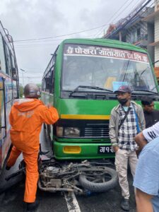 बसले ग १२ प ९८५० नम्बरको मोटसाइकललाई ठक्कर दिँदा मोटरसाइकल चालक तनहुँको देवघाट गाउँपालिका घर भएका बर्ष २१ को भिम बहादुर सारु घाइते भएको जिल्ला ट्राफिक कार्यालय कास्की प्रमुख भानु शर्माले जनाउनु भएको छ । मोटरसाइकल चालक सारुको कम्मर र खुट्टामा चोट लागेको छ । उनको मणीपाल अस्पतालमा उपचार भइरहेको छ ।