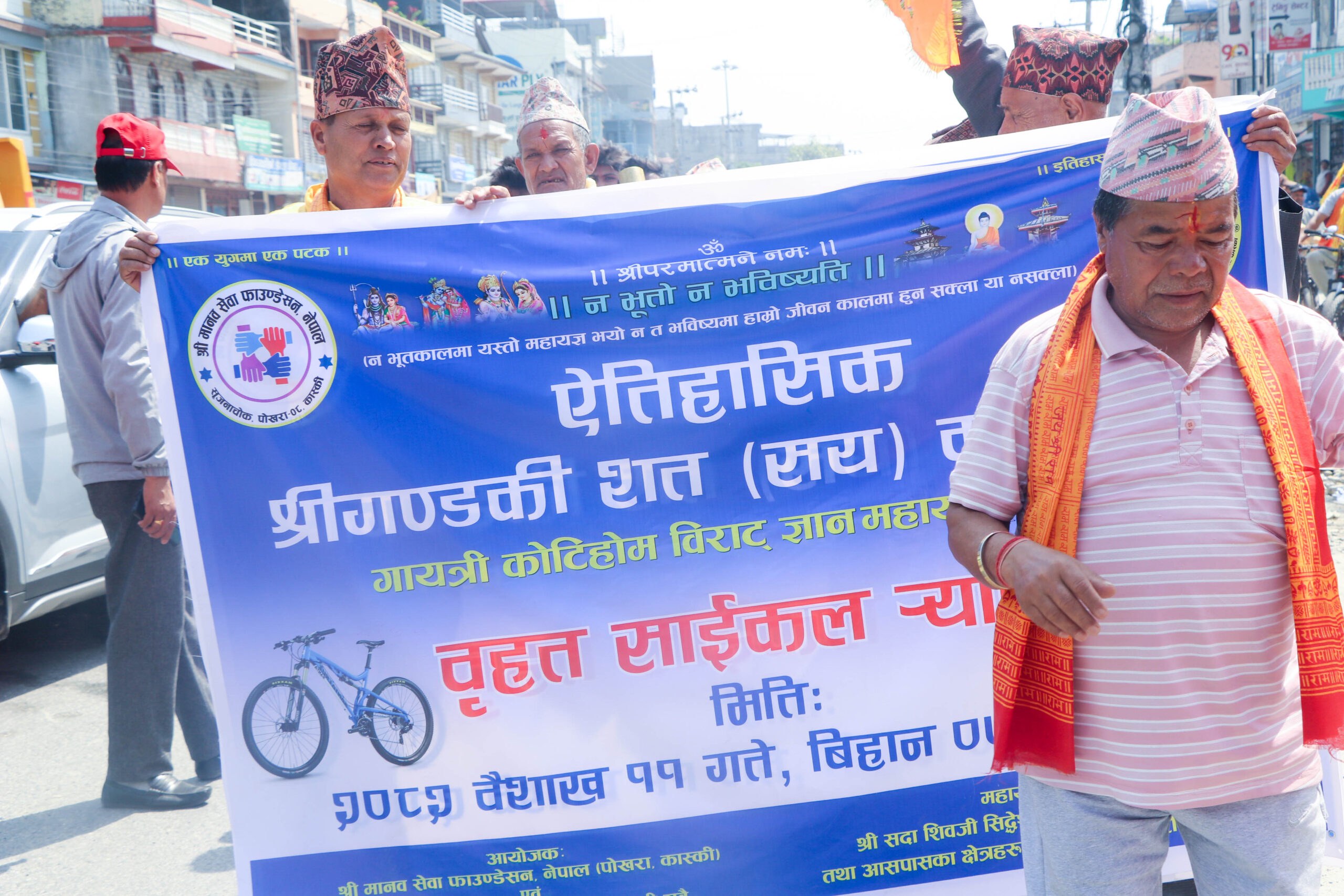 पोखरा । पोखरा महानगरपालिका वडा नं. १७, बिरौटामा सञ्चालित श्री गण्डकी शत कुण्डीय कोटिहोम विराट् ज्ञान महायज्ञको प्रचार–प्रसार तथा धार्मिक र सामाजिक सद्भावको सन्देश प्रवाह गर्न मानवसेवा फाउण्डेशनले आयोजना गरेको साइकल र्याली आज बिहान भव्य रूपमा सम्पन्न गरेको छ।