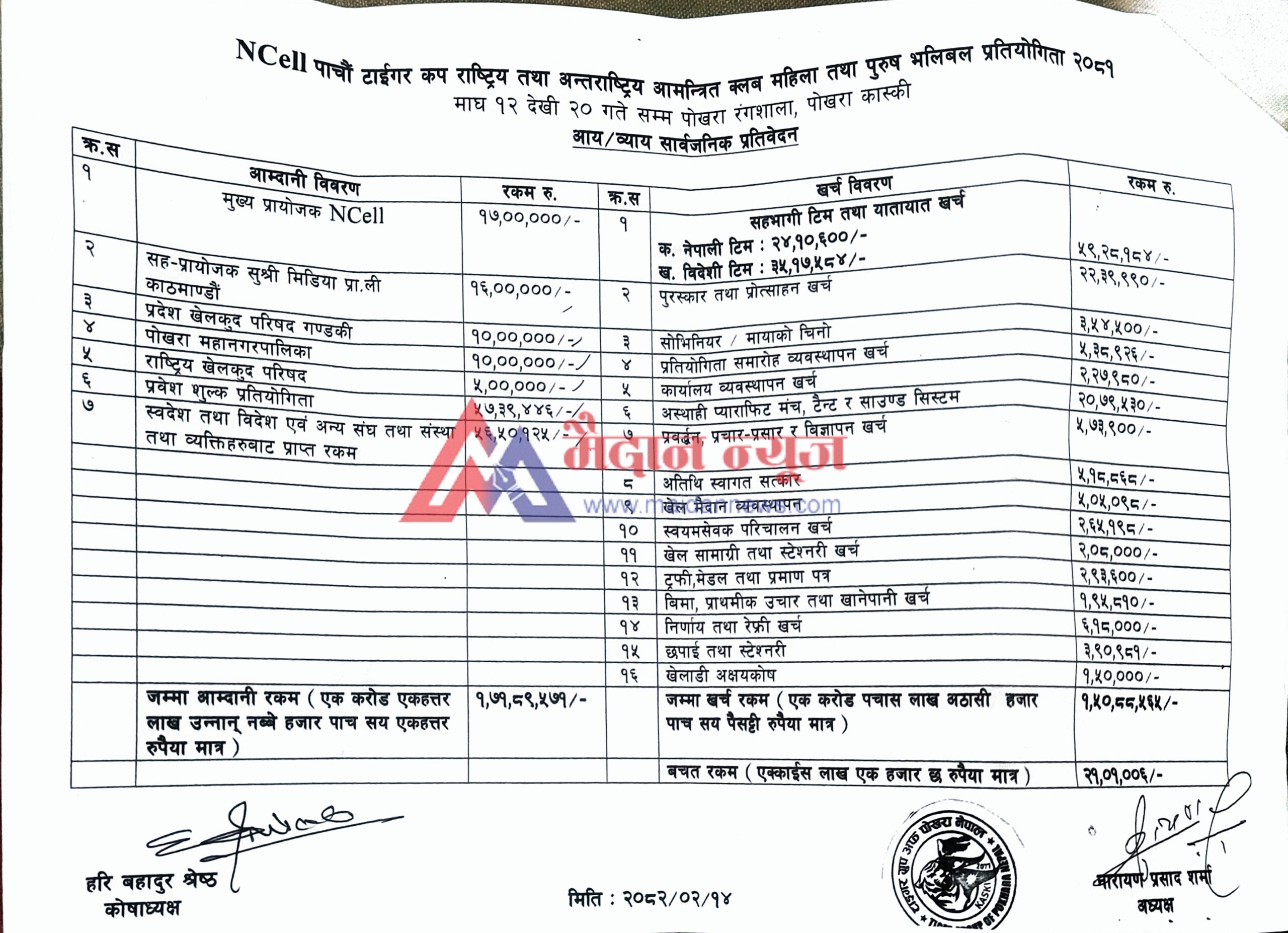 पोखरा। पोखराको रङ्गशालामा गत माघमा सम्पन्न ‘एनसेल पाँचौँ टाइगर कप राष्ट्रिय तथा अन्तर्राष्ट्रिय आमन्त्रित खुला क्लब च्याम्पियनसिप’ महिला र पुरुष भलिबल प्रतियोगिताले २१ लाख १ हजार ६ रुपैयाँ बचत गरेको छ। टाइगर ग्रुप अफ पोखरा नेपालद्वारा आयोजित पत्रकार सम्मेलनमा अध्यक्ष नारायणप्रसाद शर्माले प्रतियोगिताको आय–व्यय विवरण सार्वजनिक गर्दै १ करोड ७१ लाख ८९ हजार ५७१ रुपैयाँ आम्दानी र १ करोड ५० लाख ८८ हजार ५६५ रुपैयाँ खर्च भएको जानकारी दिए।