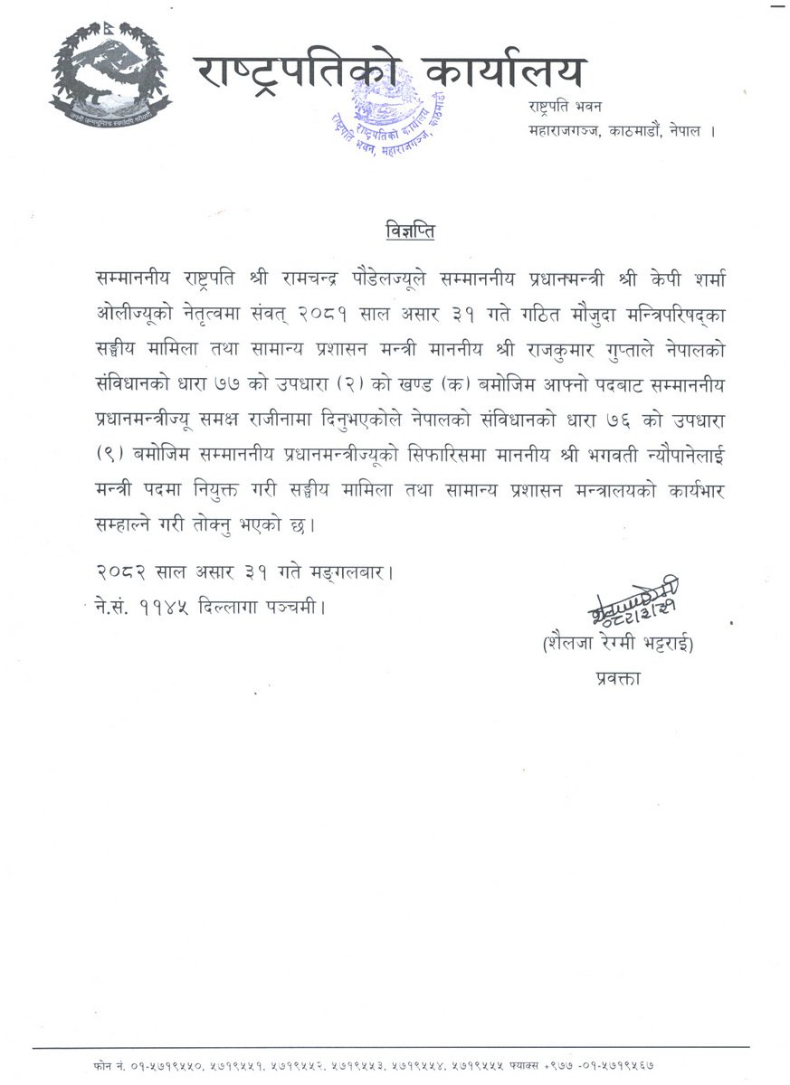 राष्ट्रपति कार्यालयकी प्रवक्ता शैलजा रेग्मी भट्टराईद्वारा जारी विज्ञप्तिअनुसार, न्यौपानेलाई संघीय मामिला तथा सामान्य प्रशासन मन्त्रालयको जिम्मेवारी प्रदान गरिएको छ। यसअघि सो मन्त्रालयका मन्त्री राजकुमार गुप्ताले भ्रष्टाचारसम्बन्धी आरोपमा मुछिएपछि मंगलबार संविधानको धारा ७७ को उपधारा (२) को खण्ड (क) बमोजिम प्रधानमन्त्रीसमक्ष राजीनामा दिएका थिए।
