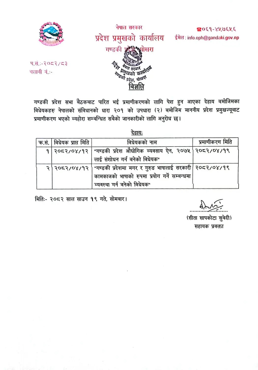 गण्डकी प्रदेशका प्रमुख डिल्लीराज भट्टले प्रदेश सभाबाट पारित भई आएका दुई वटा विधेयकलाई संविधानको धारा २०१ को उपधारा (२) बमोजिम आज (सोमबार) प्रमाणीकरण गरेका छन् ।