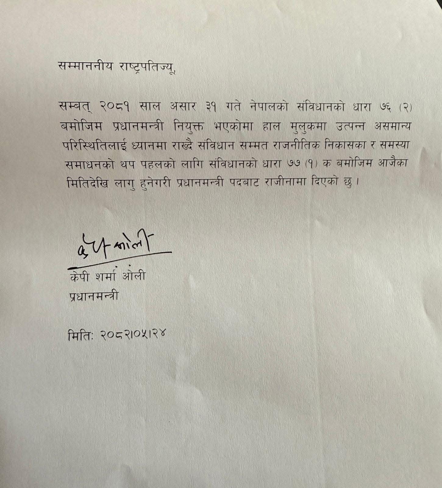 प्रधानमन्त्री ओलीले राजीनामा पत्रमा उल्लेख गरेका छन्, “मुलुकमा उत्पन्न असमान्य परिस्थितिलाई ध्यानमा राख्दै संविधान सम्मत राजनीतिक निकास र समस्या समाधानको थप पहलका लागि संविधानको धारा ७७ (१) क बमोजिम आजैका मितिदेखि लागू हुनेगरी प्रधानमन्त्री पदबाट राजीनामा दिएको छु।”
