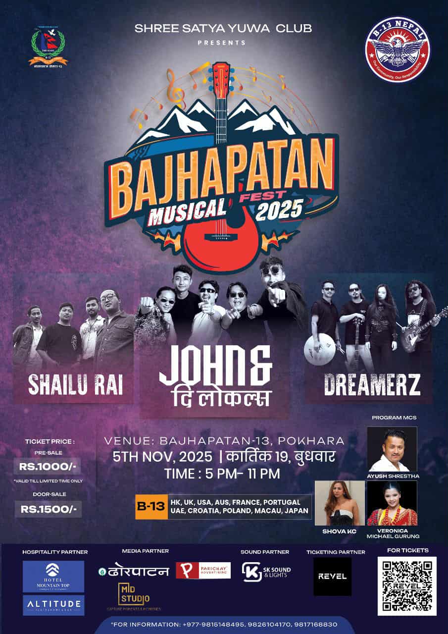 पोखरा । बाझापाटन १३ (बि१३) को आयोजनामा पोखरामा म्युजिकल फेस्ट २०२५ हुने भएको छ । पोखरा महानगरपालिका वडा नम्बर १३ बाझापाटनमा आगामी बुधबार उक्त फेष्ट हुने भएको हो ।