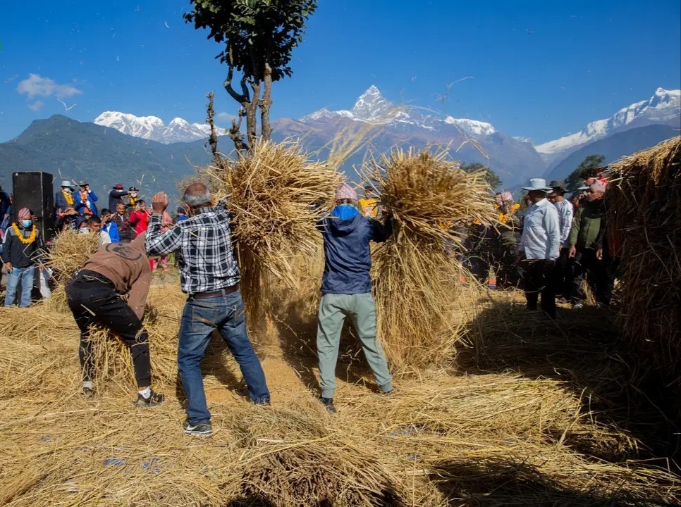 पोखरा । असारमा हिलोगोरुले हिलो छ्याप्दै रोपिएको धान कात्तिक–मंसिरमा परम्परागत शैलीमै भित्र्याउने नेपाली कृषिसंस्कृतिलाई नयाँ पुस्ता र विदेशी पर्यटकसँग जीवन्त जोड्ने उद्देश्यले पोखरा पर्यटन परिषद्ले शनिबार पोखरा–१९ पुरुन्चौरको चुरुंगामा दोस्रो दाइँ महोत्सव आयोजना गरेको छ।