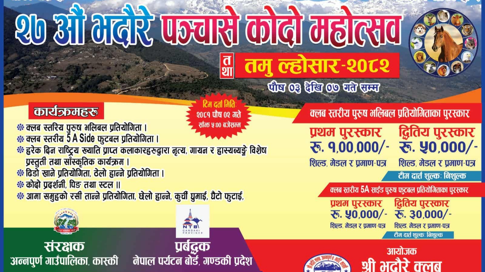 पोखरा । अन्नपूर्ण गाउँपालिका–६ भदौरे कास्कीमा पुस ३ देखि ७ गतेसम्म २७ औँ भदौरे पञ्चासे कोदो महोत्सव तथा तमु ल्होसार २०८२ सुरु हुने भएको छ। महोत्सव खेलकुद, सांस्कृतिक प्रस्तुति, स्थानीय उत्पादन र पर्यटन प्रवर्द्धन केन्द्रित रहने आयोजकले जनाएको छ।