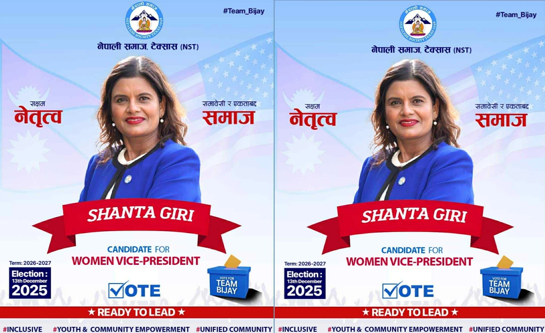 पोखरा । नेपाली समाज टेक्सासमा आगामी २०२६÷२७ का लागि नेतृत्व चयनको चर्चा सुरु भएसंगै धेरै सघर्षबाट उदाएकी एउटा नाम झनै आकर्षणको केन्द्र बनेको छ । बहुआयामिक व्यक्तित्वका धनि, दीर्घ अनुभव, निरन्तर समाजसेवा, दृढ प्रतिबद्धता र संवेदनशील नेतृत्वदायि क्षमताका कारण महिला उपाध्यक्ष पदकी उम्मेदवारका रूपमा प्रस्तुतः गर्नु भएको छ शान्त गिरीले ।