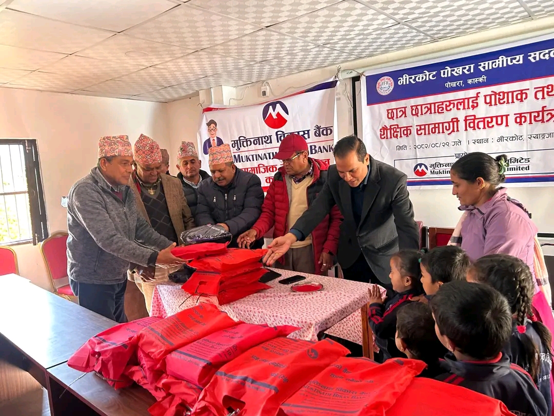 विद्यार्थीलाई शैक्षिक सामग्री तथा विद्यालय पोशाक वितरण गर्दै मुक्तिनाथ विकास बैंकको क्षेत्रिय कार्यालय पोखराका प्रमुख बाबुराम ढकालले विपन्न तथा जेहेन्दार विद्यार्थी र सामाजिक रुपमा अप्ठ्यारोमा परेको वर्गलाई बैंकले सहयोग गर्दै आएको बताए ।