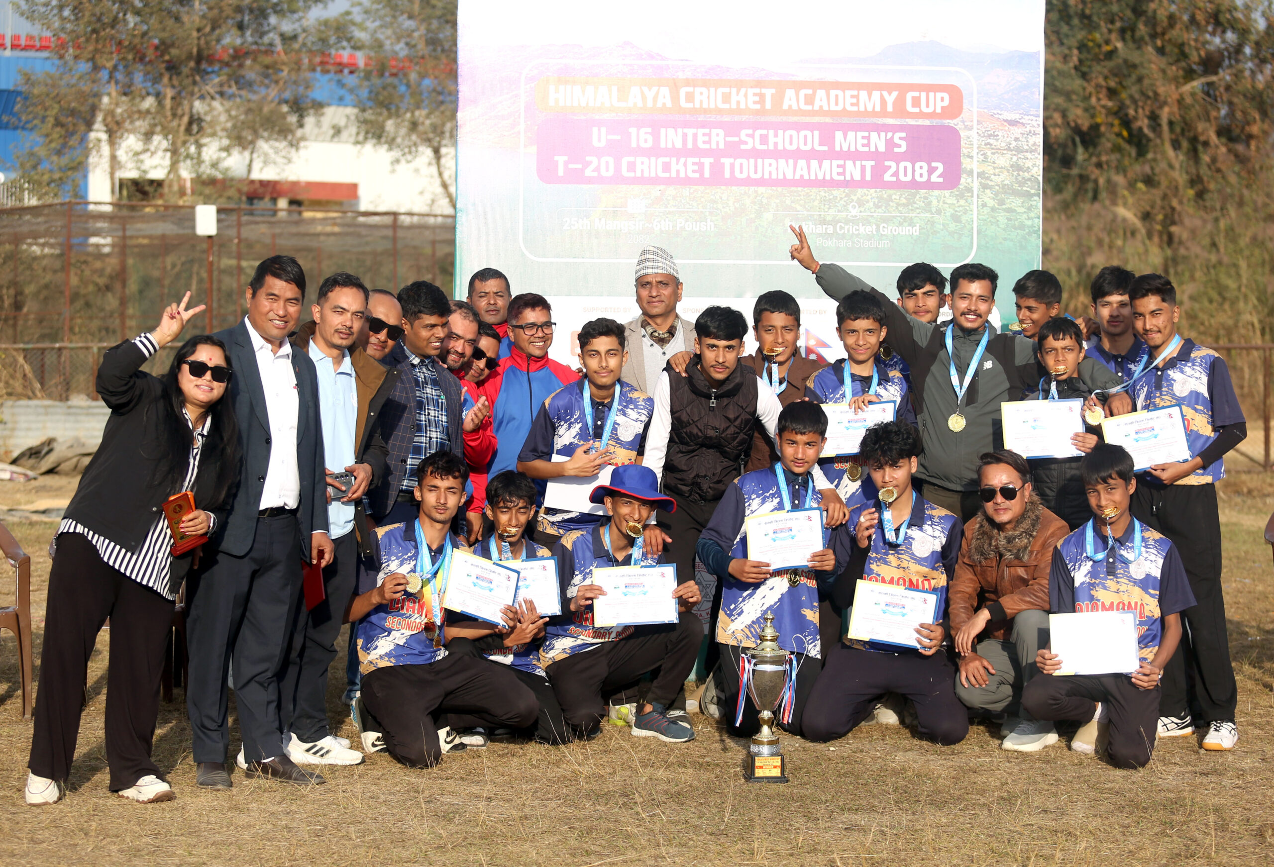 पोखरा । हिमालय क्रिकेट एकेडेमी कप २०८२ यु–१६ अन्तर विद्यालय पुरुष टि–२० क्रिकेट प्रतियोगिताको उपाधि डायमण्ड सेकेण्डरी स्कुलले जितेको छ । आइतबार पोखरा रंगशालामा सम्पन्न फाइनल खेलमा डायमण्डले जनप्रकाशलाई २ विकेटले पराजित गर्दै प्रतियोगिताको उपाधि हात पारेको हो ।