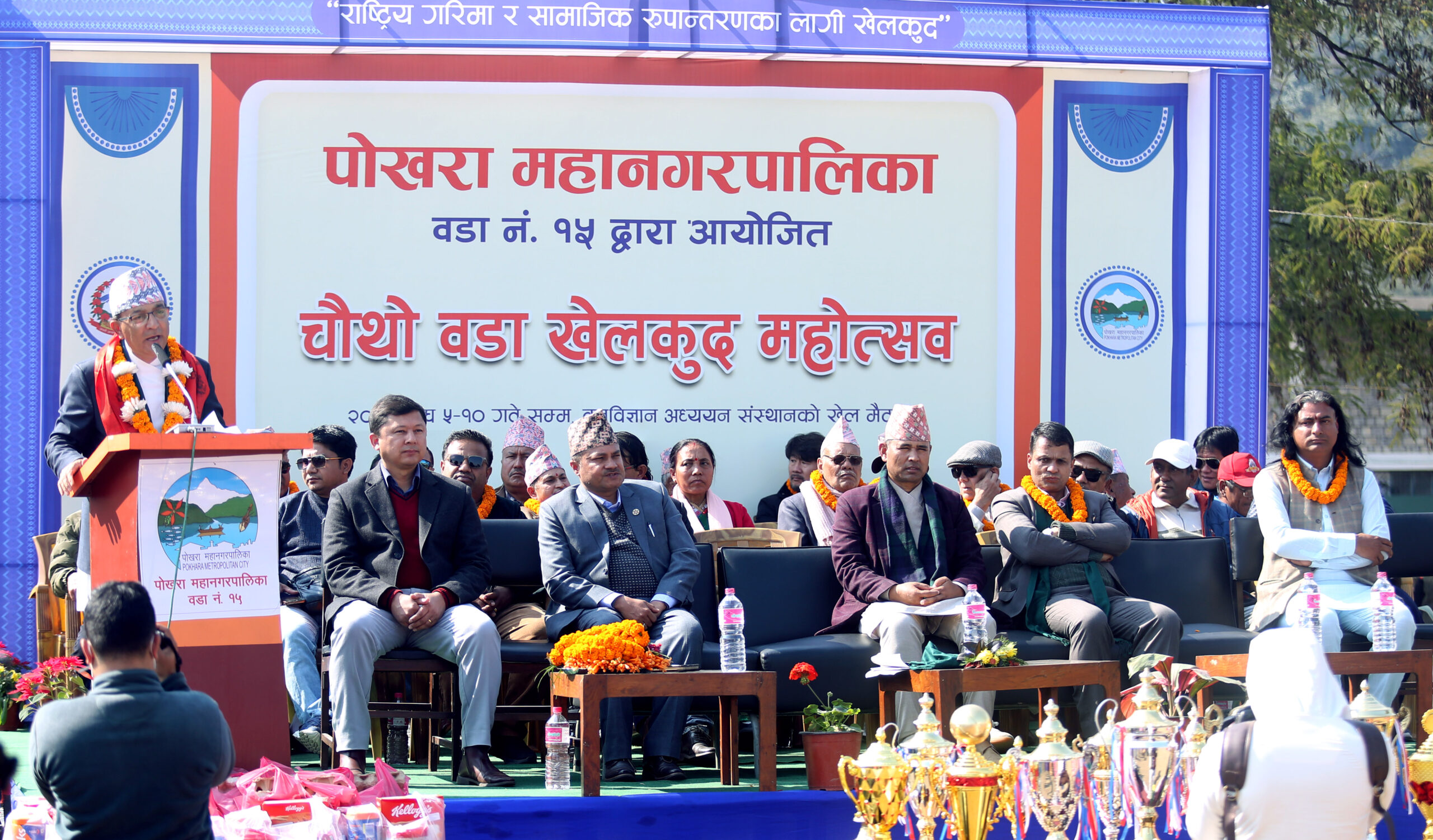 पोखरा । पोखरा महानगरपालिका वडा नं १५ मा चौथो संस्करणको वडा खेलकुद महोत्सव सुरु भएको छ । महोत्सवको पोखरा महानगरका प्रमुख धनराज आचार्यले उद्घाटन गरे । महोत्सवको उद्घाटन गर्दै मेयर आचार्यले सवै उमेर समुहकालाई समेटेर वडाको खेलकुद गतिविधीलाई समेट्ने गरी वडा खेलकुद महोत्सवको आयोजना गरी खेलकुद महोत्सव आयोजना गरेकोमा धन्यवाद ब्यक्त गरे ।