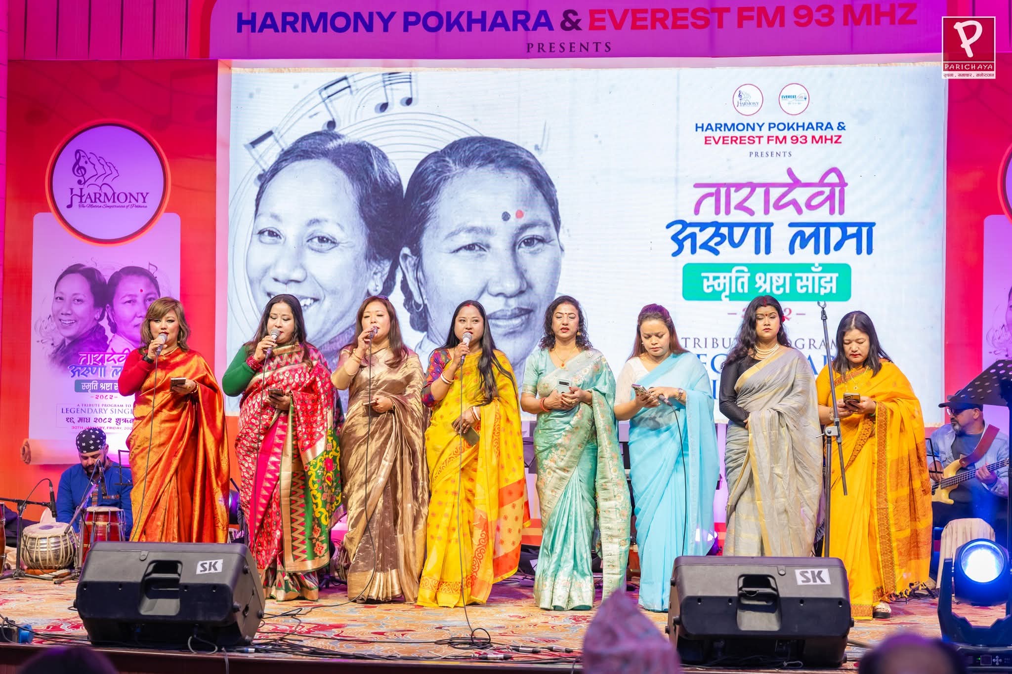 पोखरा महानगरपालिकाको प्रवद्र्दनमा आयोजित श्रष्टा स्मृति साँझमा हार्मोनीका कलाकारहरुले सामुहिक बन्दना र त्यसलगत्तै लगातार तारादेवी र अरुणा लामाका कालजयी गीतहरु ‘शुभकामना भरी’, ‘उकाली ओरालीहरुमा’, ‘पोहोर साल’, ‘एक फूल झरेर के भो ? ’, ‘ए कान्छा ठट्टैमा’, ‘हेर न हेर कान्छा’, ‘फूललाई सोंधे’ गुञ्जाउँदै स्वर किन्नरी द्वयलाई श्रद्दाञ्जली अर्पण गर्दै गुञ्जाएपछि कार्यक्रम शुरु भएको थियो । त्यसपछि पालैपालो स्टेजमा उक्लिएका गायीकाहरु ईतु जोजिजु, शितल थापा, कौशल्या गुरुङ, रजनी ऋदम राई, लक्ष्मी गिरी, मितु पाल र बबी दियाली रसाईलीले सांगीतिक प्रस्तुती दिए । जहाँ उनीहरुले तारादेवी र अरुणा लामाका एकपछि अर्को गर्दै गीतहरु गुञ्जाउँदा दर्शक नोस्टाल्जिक बने भने आफ्नै गीत सुनाउँदा दर्शक आल्हादित बने । कार्यक्रममा ईतुले अरुणा लामाको ‘मैले जीवनलाई कसरी सजाएँ’ र ‘आफ्नो र त्यो कहिले घाम, कहिले छायाँ’, सितल थापाले तारादेवीका ‘टाढाबाट बोलाएको’ र ‘जति माया लाएपनि’, कौशल्या गुरुङले तारादेवीको ‘जताततै खोजें’ र आफ्नो ‘जून राम्रो जुनेली रातको’, रजनी ऋदम राईले अरुणा लामाको ‘भेटिनु छुटिनु’ र आफ्नो ‘को छ र मेरो’, लक्ष्मी गिरीले अरुणा लामाको ‘उदास मेरो जीवन कथा’ र आफ्नो ‘हिमालकी प्यारी छोरी’, मितु पालले अरुणा लामाको ‘हाँसी राखें, बोली राखें’ र आफ्नो ‘परिभाषा हराएको’ तथा बबी दियाली रसाइलीले तारादेवीको ‘जबजब मेरा सपनाहरु’ गीत भ्वाईलिनको साथमा गुञ्जाएका थिए ।