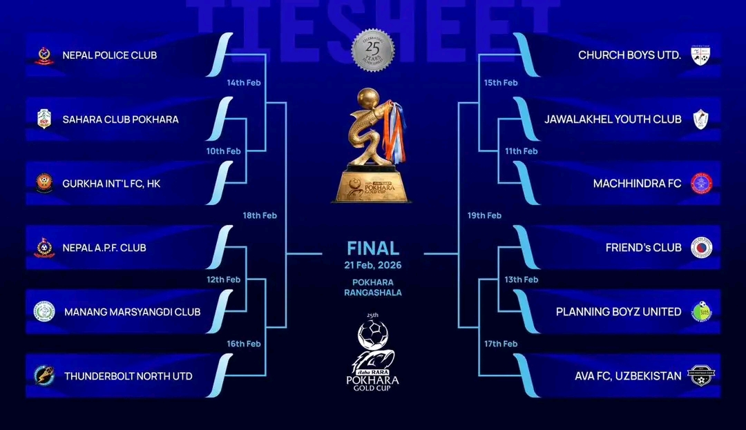 पोखरा । पोखराको सहारा क्लबले आयोजना गर्न लागेको आहा ! रारा पोखरा गोल्डकप फुटबल प्रतियोगिता–२०८२ को खेल तालिका सार्वजनिक भएको छ । माघ २७ गतेदेखि फागुन ९ गतेसम्म पोखरा रंगशालामा सञ्चालन हुने प्रतियोगिताको उद्घाटन खेलमा आयोजक सहारा क्लबले हङकङको गोर्खा इन्टरनेशनल फुटबल क्लबसँग भिड्ने भएको छ ।