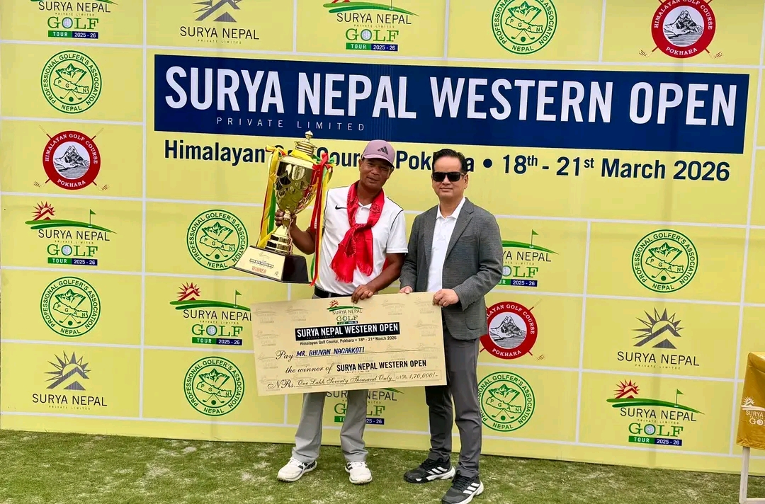 पोखरा । सूर्य नेपाल गल्फ टुर २०२५-२६ अन्तर्गत पाँचौं प्रतियोगिता तथा २६ औँ संस्करणको सूर्य नेपाल वेस्टर्न ओपनको उपाधि भुवन नगरकोटीले जितेका छन्। आज इभन-पार ६९ खेलेका उनले समग्रमा ३-अन्डर २ सय ४ को स्कोरमा सञ्जय लामालाई एक स्ट्रोकले हराउँदै उपाधिमा ह्याट्रिक गर्न सफल रहे।